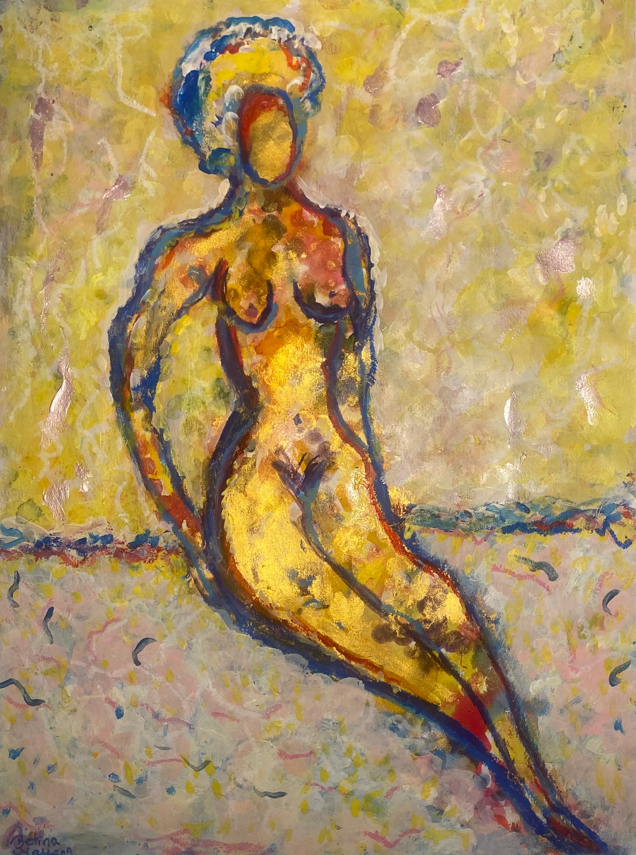 Dame i guld str. A4 papir/akrylmaling 800 kr.